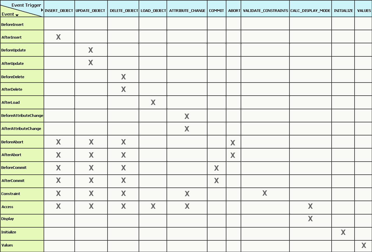 The following table lists all the event triggers available in WS-AppServer. The columns show the triggers, while the rows list the corresponding events that are triggered.