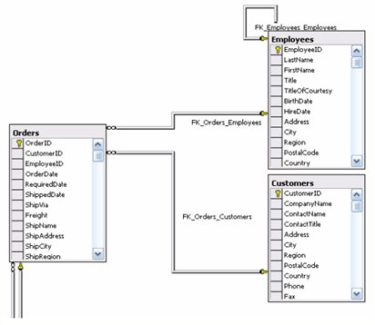 Consider the possible relationships between the Orders table and the Employees and Customers tables of the Northwind database (MS-SQL Server). The following figure depicts the schematic representation of the tables and their relationships.